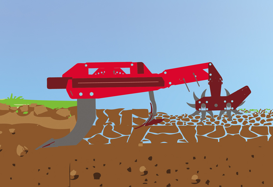 The tine used on deep rippers enters the soil at a right angle, undermining the plough sole, crumbling it with additional wings, and crushing the root system of weeds.